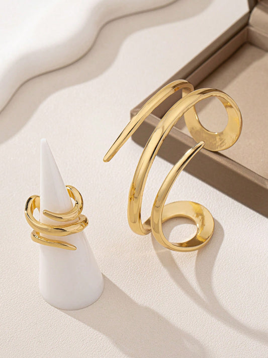 1set (1 Geometric Line Gold Bracelet And 1 Geometric Line Thick Ring) European And American Style Vintage Fashionable Gold Geometric Line Bracelet And Thick Ring Combination Set, Cool And Stylish Long-Lasting Color Resistant Thick Bracelet And Ring Jewelr