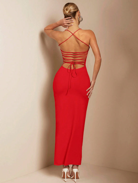 Straight Long Dress With Deep Open Back And Elaborate Strap Detailing For Women Backless Dress